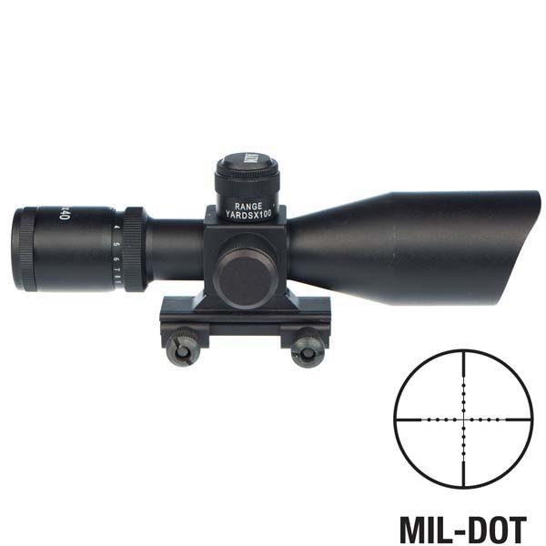 Aim Sports 3-9x40 Titan Dual-Illuminated Scope with Cut Sunshade Picatinny Mount Mil-Dot Reticle MOA 1/4 With BDC for .223 1 Inch Tube Diameter * One piece aircraft grade aluminum body built to withstand constant heavy recoil * Nitrogen charged